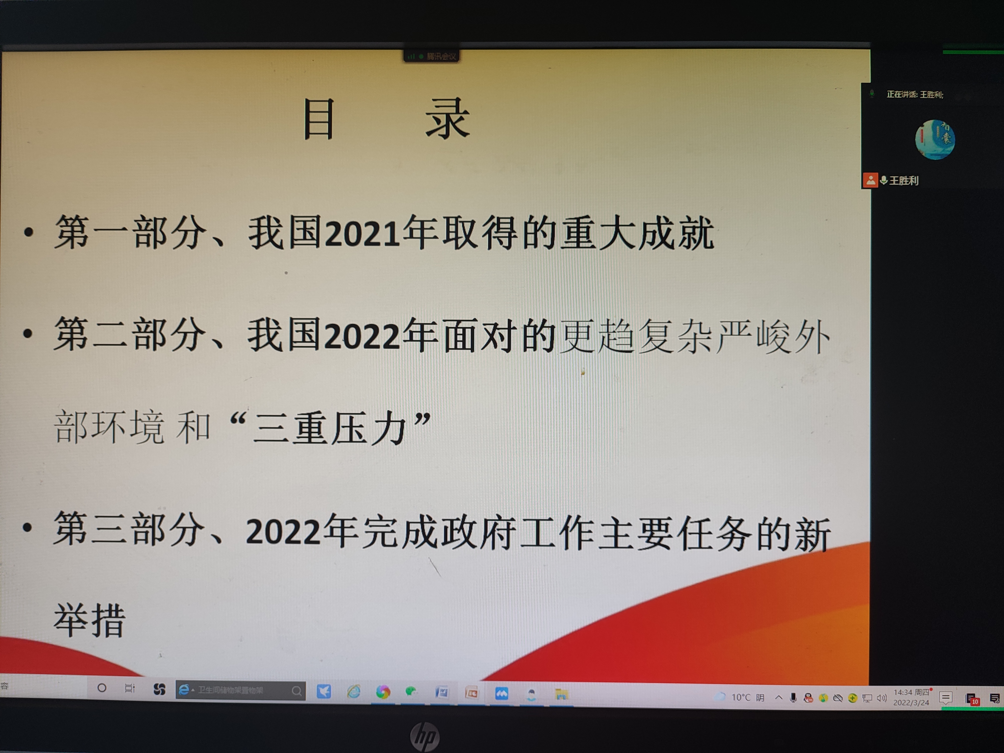 3月24日,院长王胜利为本科生上线上思政课,结合专业课内容,讲解全国“两会”精神和《2022年政府工作报告》心得体会。他从“我国2021年取得的重大成就”“2022年面临复杂严峻环境和‘三重压力’”“2022年主要任务和新举措”三方面入手,分享了自己的观点。他谈到,要认识到我国经济发展面临的风险挑战增多,坚持“稳中求进”的总基调,围绕中央提出的继续做好“六稳”“六保”工作目标,统筹疫情防控和经济社会发展,以优异的经济发展成绩迎接党的二十大胜利召开。