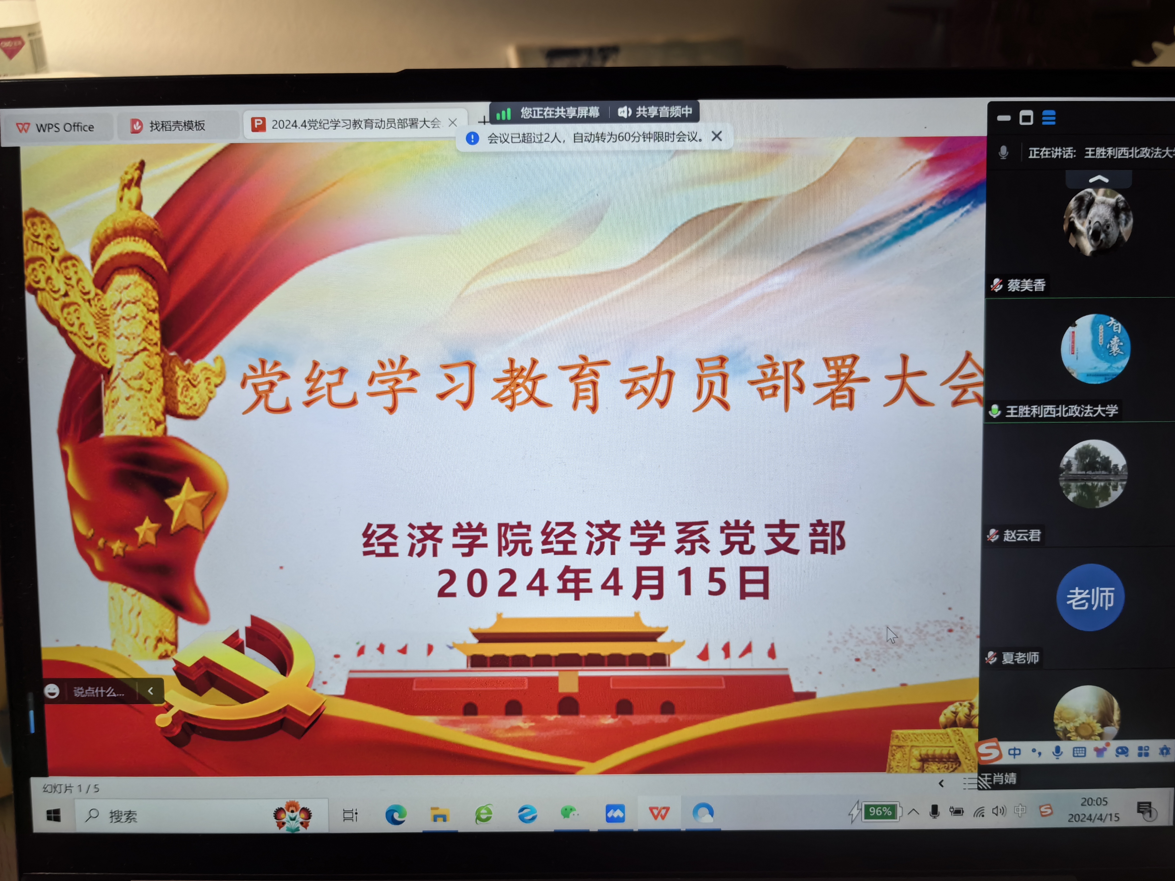4月15日晚上,澳门新葡京娱乐城 经济学系党支部通过腾讯会议召开党纪学习教育动员部署大会,澳门新葡京娱乐城 院长王胜利、经济学系支部全体党员教师参加学习,会议由支部书记赵倩主持。