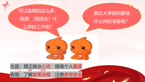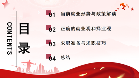 发扬奋斗精神,积极迎接挑战。树立正确的择业观和就业观对于个人的职业发展和社会的稳定都具有重要意义。在选择职业时,要综合考虑自己的实际情况和需求,选择适合自己的职业方向,不断学习和进步,以实现个人和社会双赢。宣讲员王娅楠同学以自己在实习实践中的个人经历为例子,向同学们分享了制作简历、求职信息获取、投递简历、面试技巧等,帮助同学们科学制定职业规划,明确职业目标,并通过练就过硬本领,掌握求职技巧,克服就业畏难心态,坚定理想信念,实现个人职业理想与社会价值。