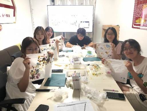 活动伊始,主持人向大家讲解了植物拓染历史原理、选材技法及全流程操作,同步强调工艺规范与安全事项。活动中,伴随着细密有序的敲击声律,片片花瓣在手帕表面渐次舒展,叶脉纹路与天然色素经过反复捶拓,在织物上定格出草木的原始肌理与斑斓色谱。这些独一无二的生态印记,既是自然的馈赠,更凝结着每位创作者的诗意巧思。