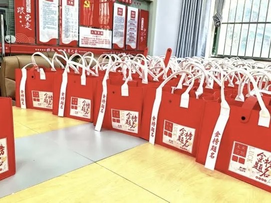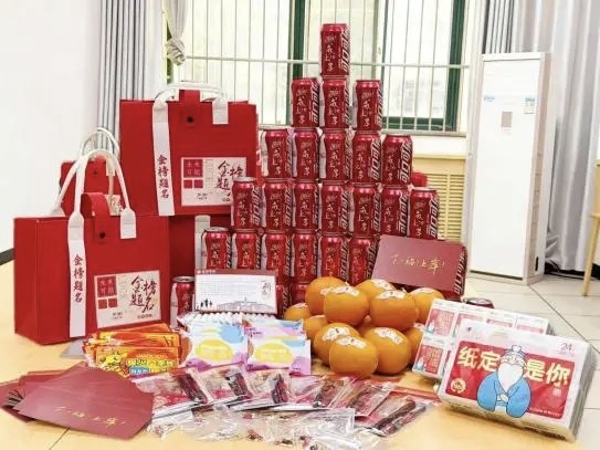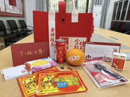 悉心筹备的十件寓意深远的暖心好物中,以“十全十美”的美好祝愿陪伴学子逐梦征程:象征“文”思泉涌的文具套装,承载“暖”意相伴的两枚暖贴,寓意心想事“橙”的新鲜橙子,蕴藏“纸”定上岸的小包纸巾,代表“拭”去烦恼的湿纸巾,寄托“遍”通考点的便利贴,印有“成功上岸”的定制可乐,写有一“研”为定的祝福卡片,承载“金榜题名”真挚期许的钥匙扣。