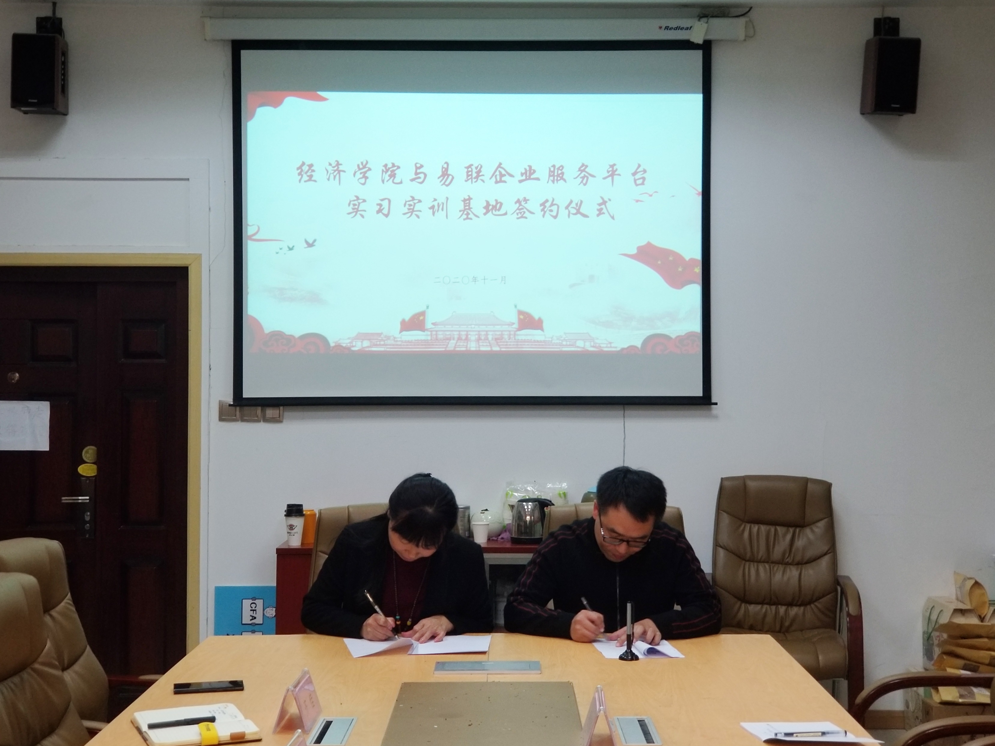 11月4日下午,易联企业服务平台与澳门新葡京娱乐城 在澳门新葡京娱乐城 长安校区澳门新葡京娱乐城 关天会议室举行实践基地共建合作协议签约仪式。易联企业服务平台董事长薛庆歌、副总经理孙彦东、技术总监张鑫鹏、办公室主任任金国,澳门新葡京娱乐城 院长赵云君、党委副书记张文渊、副院长徐梅、2018级辅导员齐佳出席签约仪式。薛庆歌和赵云君分别代表双方签署实践基地共建合作协议。
