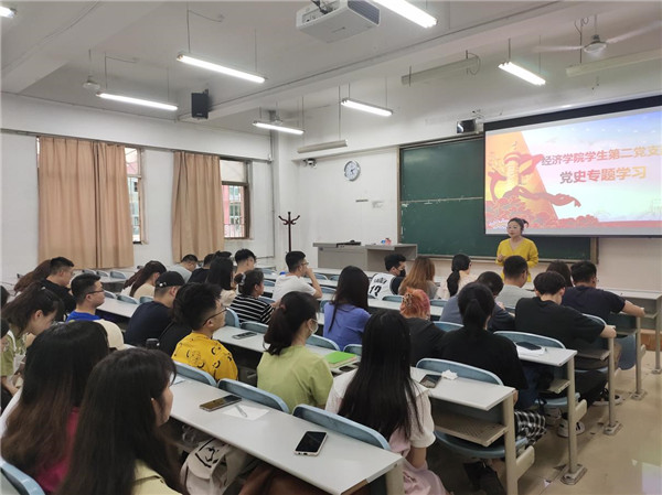 5月17日下午,澳门新葡京娱乐城 学生第二党支部于天平楼A107开展党史学习教育专题理论学习,支部副书记刘师凡同学通过十一个带有鲜明时代印记的词句,带领支部成员重温党的百年伟大历程。