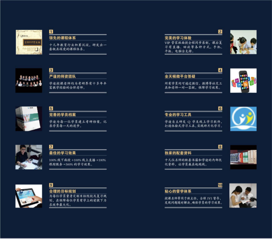 1、掌握学员基本 情况 2、安排入学测试 3、针对每位学员基础情况,制定专属学习计划 4、内部权威资料配备 |