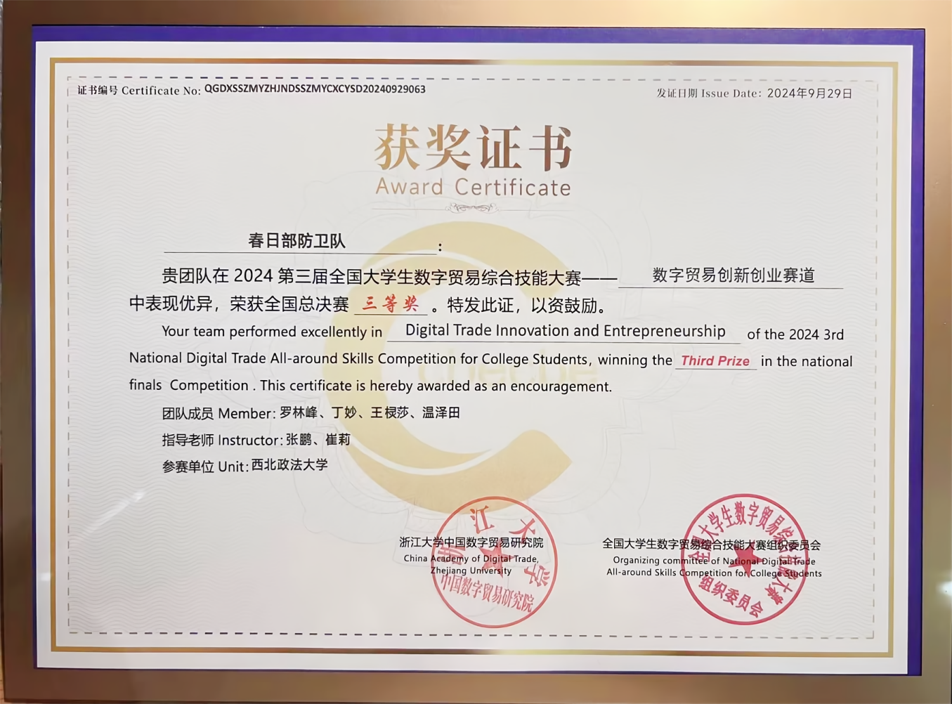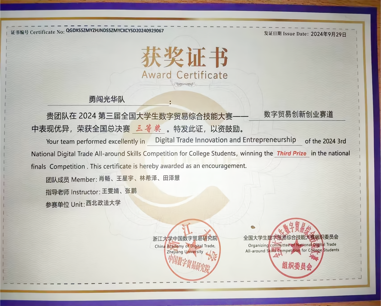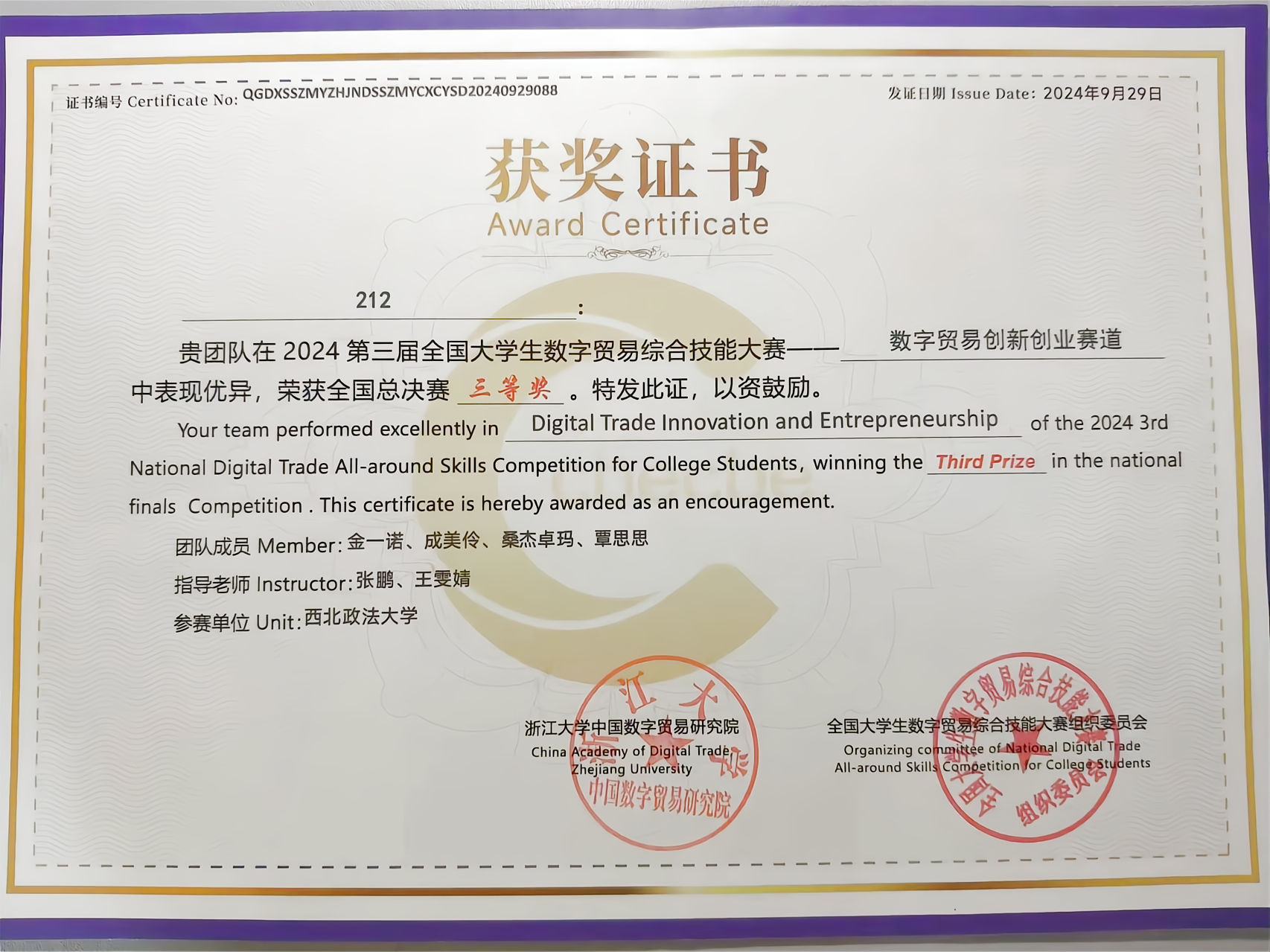 通过参加此次全国性大赛,充分展示了澳门新葡京娱乐城 创新人才培养的教育理念,展现了在数字贸易人才培养方面取得的显著成效。未来,澳门新葡京娱乐城 将继续秉持OBE培养理念,通过“以赛促学,以赛促教,以赛促改,以赛促建”的人才培养模式,实现课堂教学、社会实践与学科竞赛的深度融合,通过激发学生学习的自主意识和创新意识,培养更多服务国家数字经济高质量发展和对外开放的复合型、应用型、创新型高层次人才。