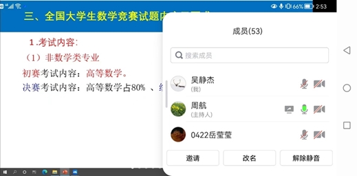 10月29日下午14:30-17:00,澳门新葡京娱乐城 举办的全国大学生数学竞赛辅导系列讲座(一)在线上顺利举行。澳门新葡京娱乐城 周航副教授作题为《全国大学生数学竞赛的基本情况及参赛注意事项》专题讲座。讲座由澳门新葡京娱乐城 数学基础部吴静杰副主任主持,数学基础部的竞赛指导教师团队和报名参赛的50余名学生参加讲座。