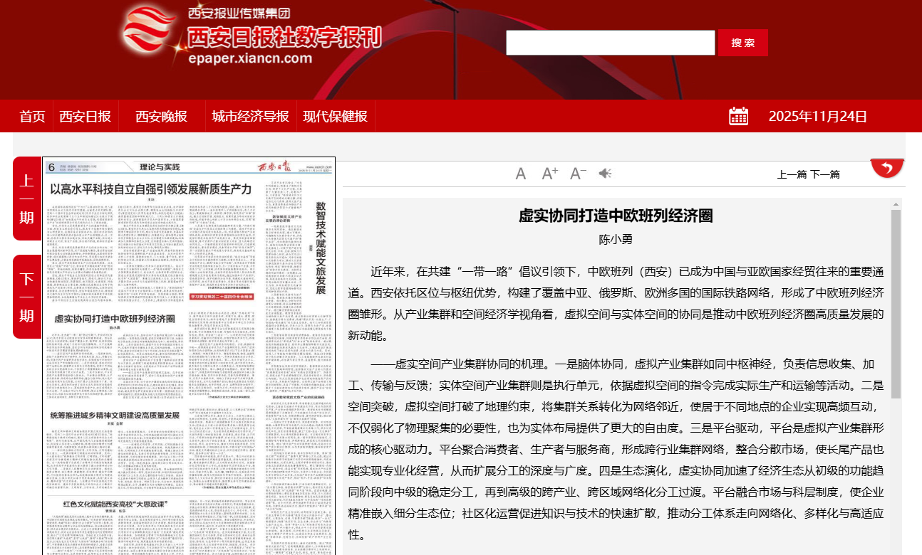 近年来,在共建“一带一路”倡议引领下,中欧班列(西安)已成为中国与亚欧国家经贸往来的重要通道。西安依托区位与枢纽优势,构建了覆盖中亚、俄罗斯、欧洲多国的国际铁路网络,形成了中欧班列经济圈雏形。从产业集群和空间经济学视角看,虚拟空间与实体空间的协同是推动中欧班列经济圈高质量发展的新动能。
